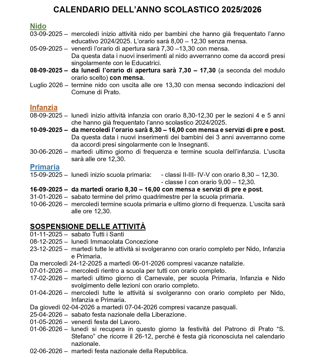 Calendario Scolastico per l'Anno 2025/2026
