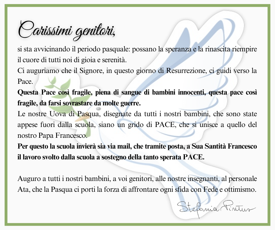 Con l'augurio di una Felice Pasqua, vi ricordiamo che domani Mercoledì 27 sarà l'ultimo giorno di scuola con orario completo, e riapriremo Mercoledì 3 Aprile!